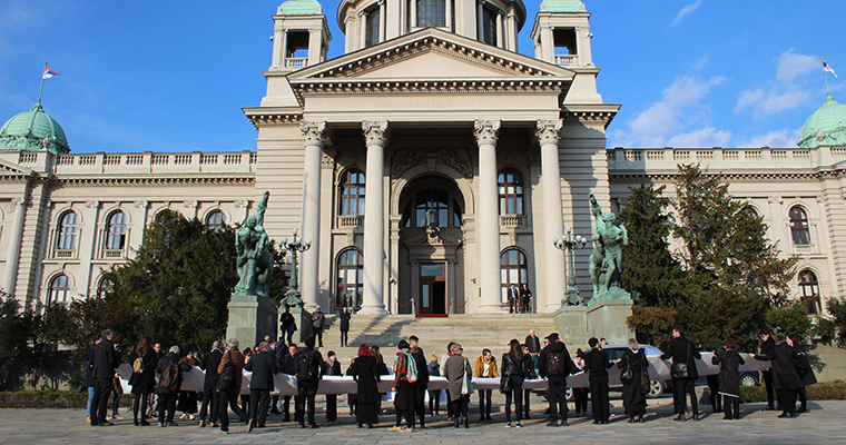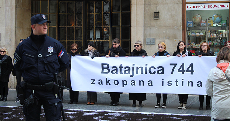 Aktivisti su izveli performans “Batajnica 744: Zakopana istina” i tom prilikom zemljom zatrpali natpis sa imenima 744 žrtave, nakon čega su krenuli u šetnju centralnim gradskim ulicama do platoa Skupštine Srbije.