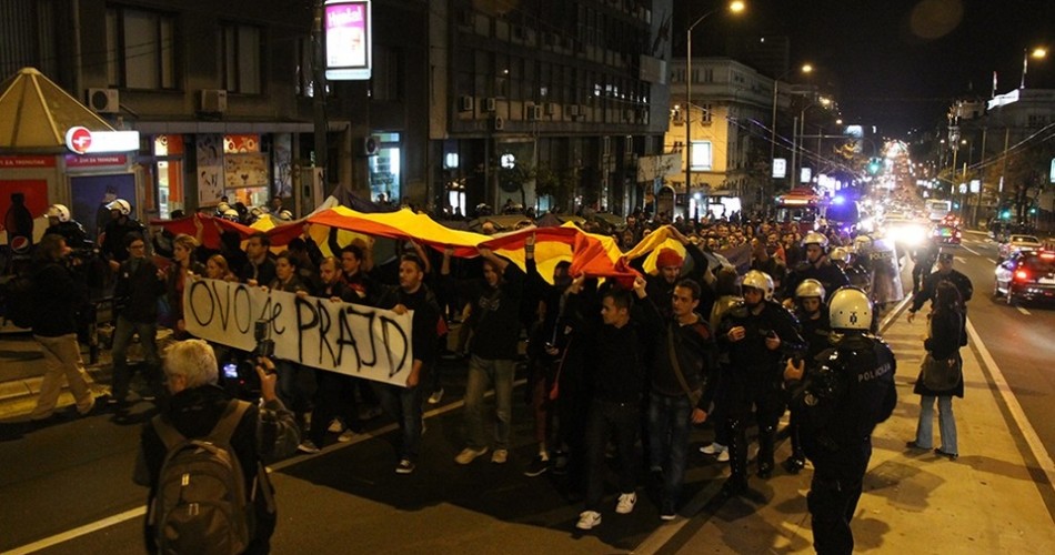Kada smo došli ispred Vlade tamo je već bilo brdo ljudi. Poznata lica prijatelja i nekih poznanika, profesora sa fakulteta… Sav strah je nestao. Zgrabili smo taj transparent, formirali kolonu i krenuli ka skupštini. U nekom trenutku je kolona krenula na trotoar – fini ljudi, šta ćeš. A ja sam, posle dva piva kojima sam “razbijala strah”, počela da se derem: na ulicu! Na ulicu! Kolona je zauzela jednu traku Kneza Miloša i nastavila da ide prema skupštini.