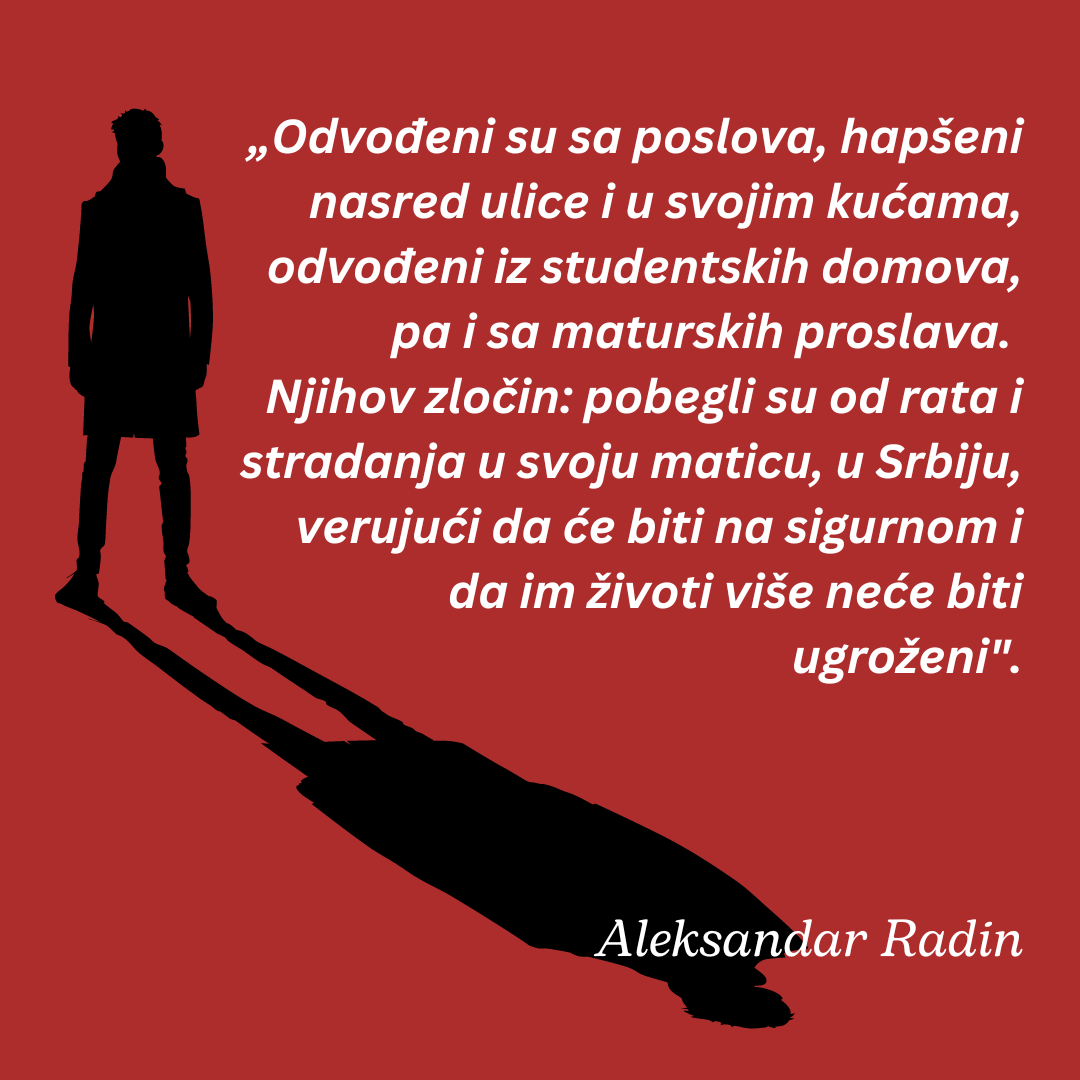 Mislili ste da vam pišem o raciji okupatorskih snaga u Novom Sadu u zimu 1942. godine? Pogrešili ste. Reč je o raciji koju je sprovela milicija Republike Srbije u leto 1995. godine nad izbeglim krajiškim Srbima. Ljudi su hapšeni i odvođeni, ne samo u Novom Sadu, već širom Savezne Republike Jugoslavije. Odvođeni su sa poslova, hapšeni nasred ulice i u svojim kućama, odvođeni iz studentskih domova, pa i sa maturskih proslava. Njihov zločin: pobegli su od rata i stradanja u svoju maticu, u Srbiju, verujući da će biti na sigurnom i da im životi više neće biti ugroženi.