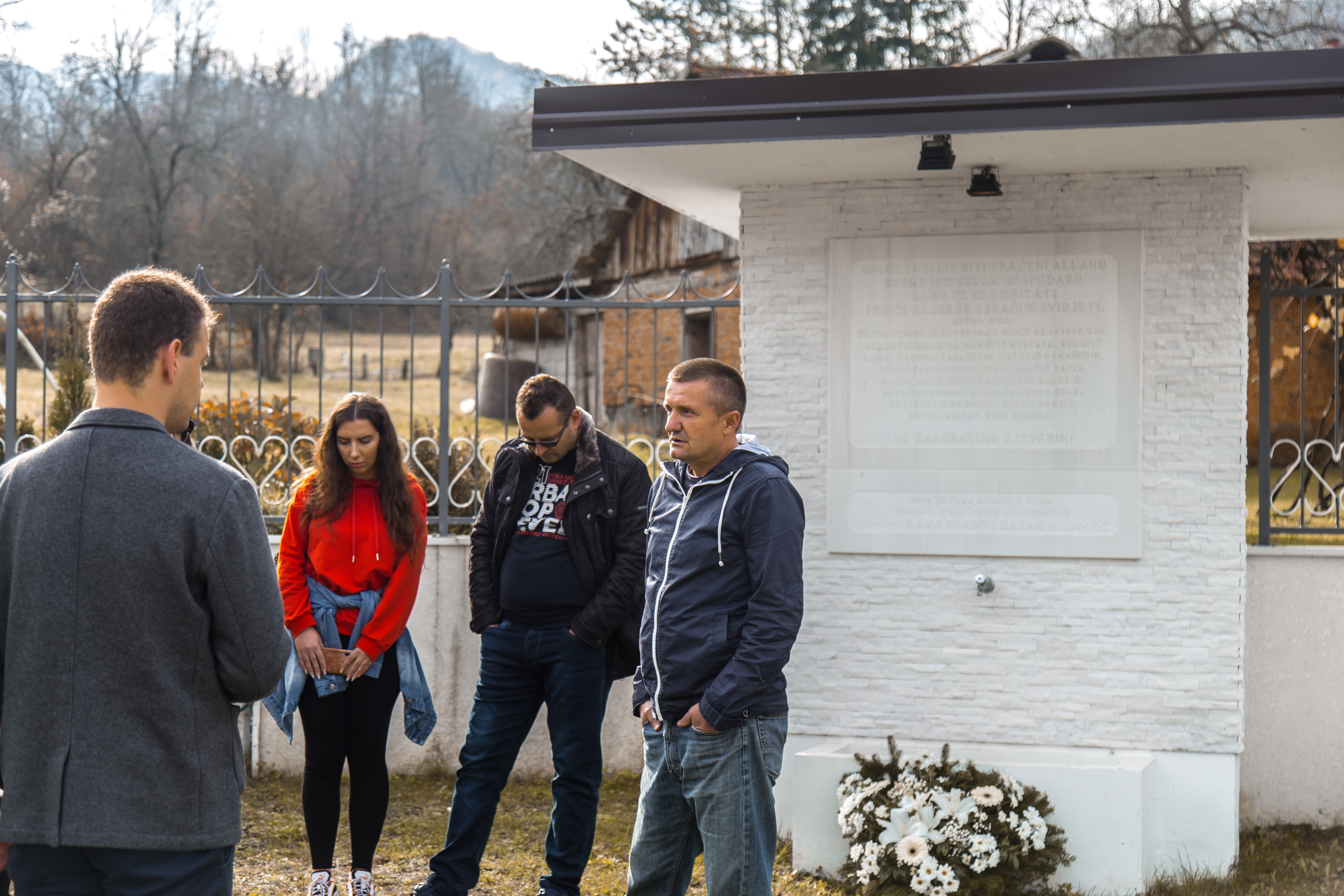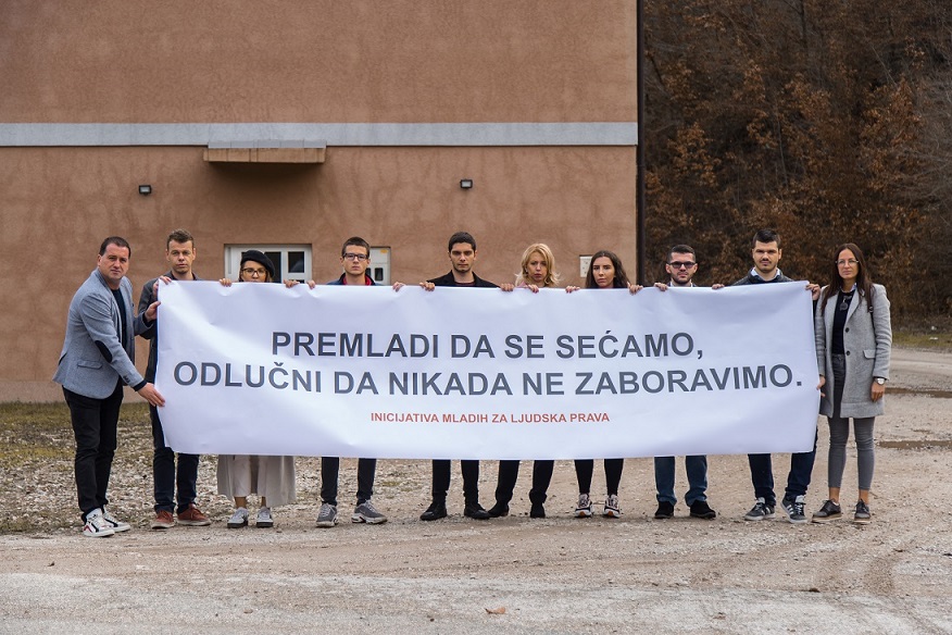 Aktivistkinje i aktivisti Inicijative mladih za ljudska prava u Sjeverinu novembra 2019. godine pored spomenika žrtvama zajedno sa članovima porodica otetih u Štrpcima i Sjeverinu, Dževadom Koldžićem i Mevludinom Hodžićem.