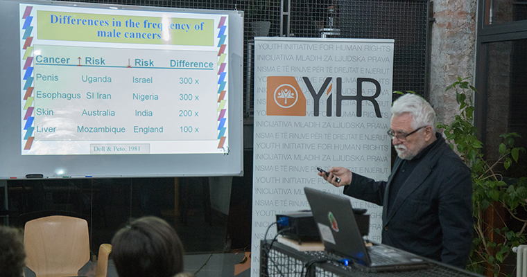 Na kraju dvodnevne radionice, dr Zoran Radovanović, epidemiolog i predsednik Etičkog komiteta Srpskog lekarskog društva, održao je javni čas o mitovima i zabludama uzročno-posledične veze između NATO intervencije i oboljevanja od raka kao posledice korišćenja osiromašenog uranijuma.