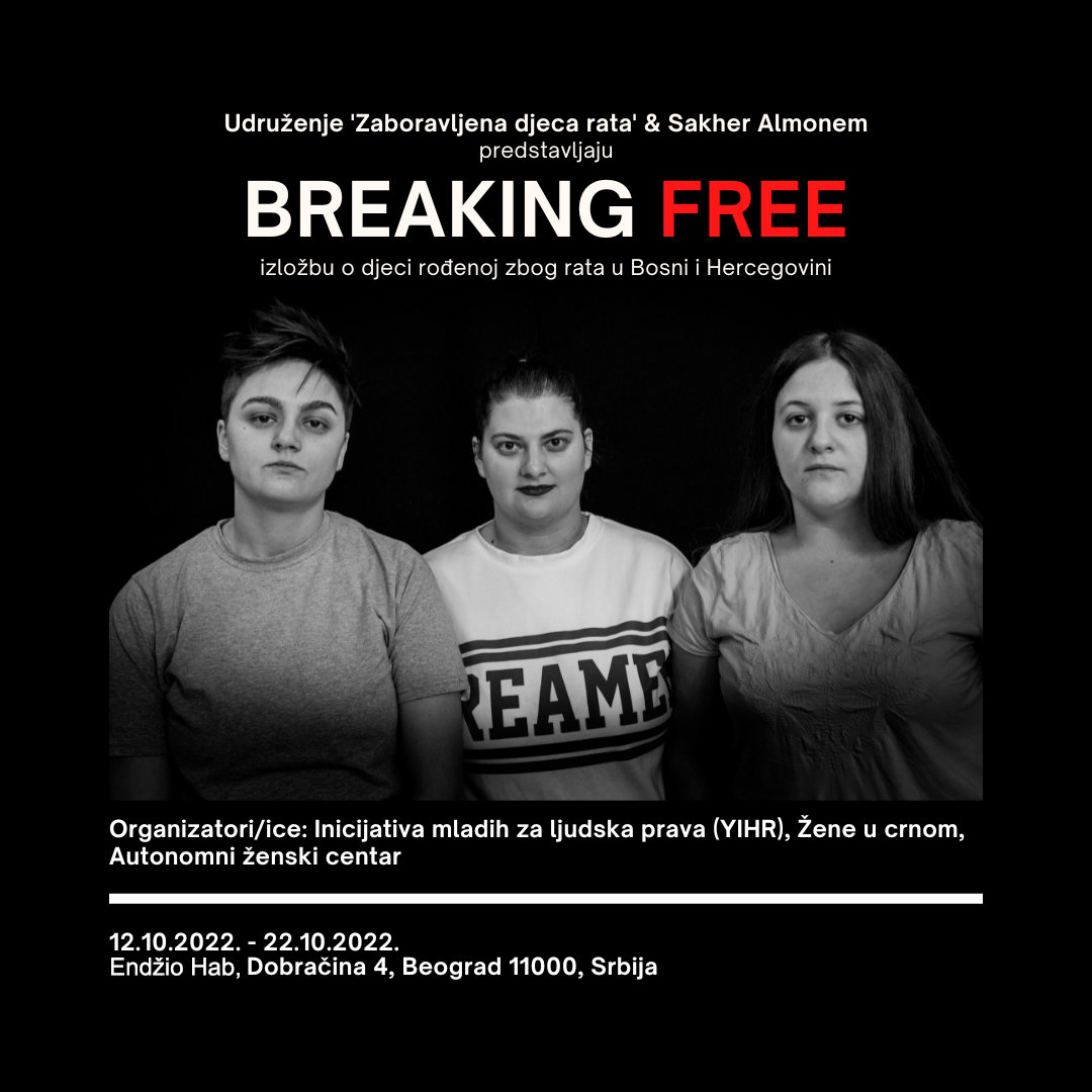 Veliko nam je zadovoljstvo da Vas pozovemo na otvaranje izložbe BREAKING FREE o deci rođenoj zbog rata u Bosni i Hercegovini koja će se održati 12. oktobra 2022. u 18:00h, u Endžio Habu (Dobračina 4).