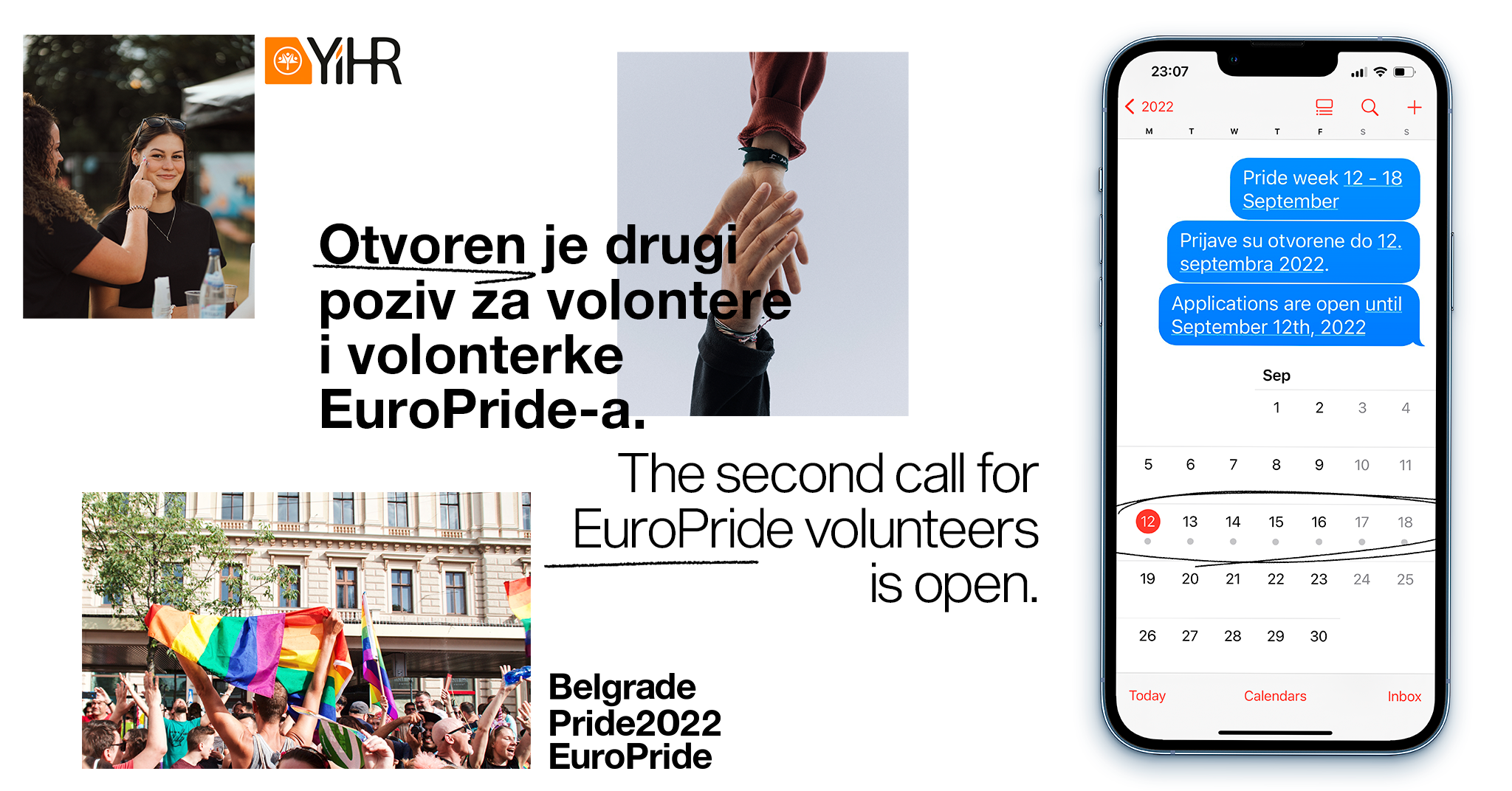 Inicijativa mladih za ljudska prava u saradnji sa Beograd Prajdom i partnerskim organizacijama, objavljuje drugi poziv za prijave za EuroPride volonterski program koji će biti otvoren do 12. septembra 2022. godine, a namenjen je svim volonterima/kama iz Srbije, regiona ili sveta koji ce tokom EuroPride-a i Europride Weeka-a biti u Beogradu.