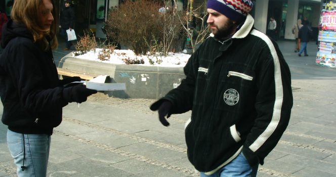 Volonteri Inicijative mladih za ljudska prava izveli su 9. februara 2005. godine u 12 sati ispred palate “Albanija” uličnu akciju u kojoj su građanima delili letke sa sloganima “Haški tribunal je antizločinački” i “Tribunal radi za nas”.