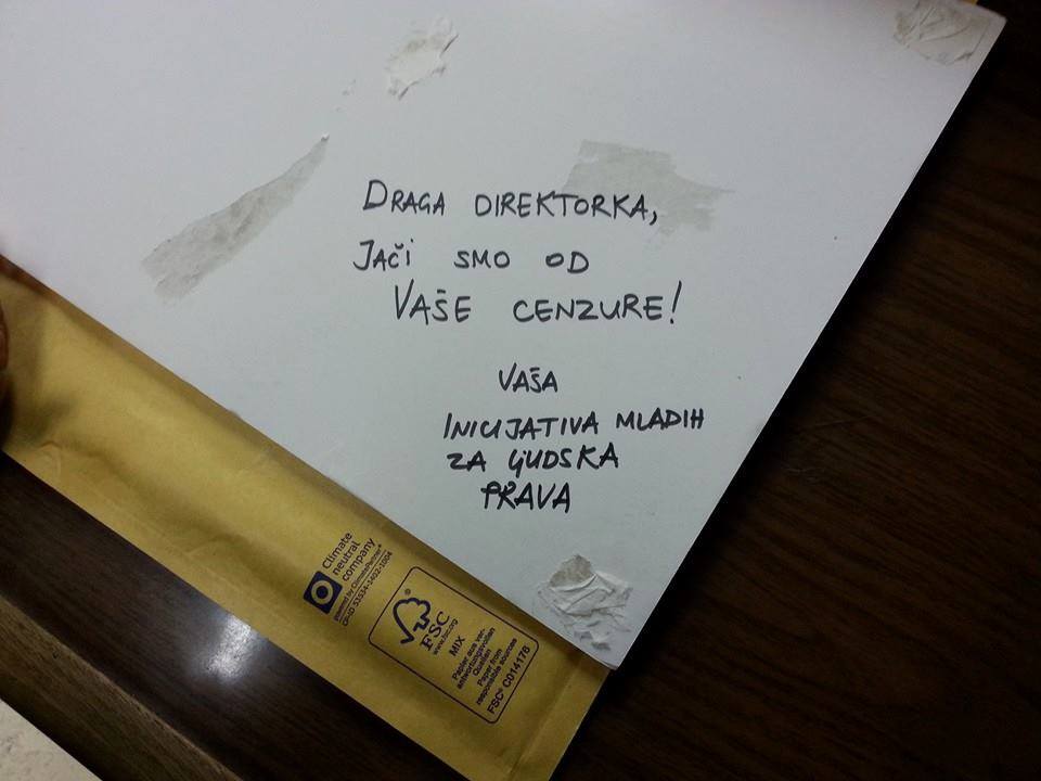 Aktivisti i aktivistkinje su direktorki Gradske biblioteke poslali jednu od fotografija sa izložbe, sa porukom: „Draga direktorka, jači smo od Vaše cenzure. Vaša Inicijativa“.