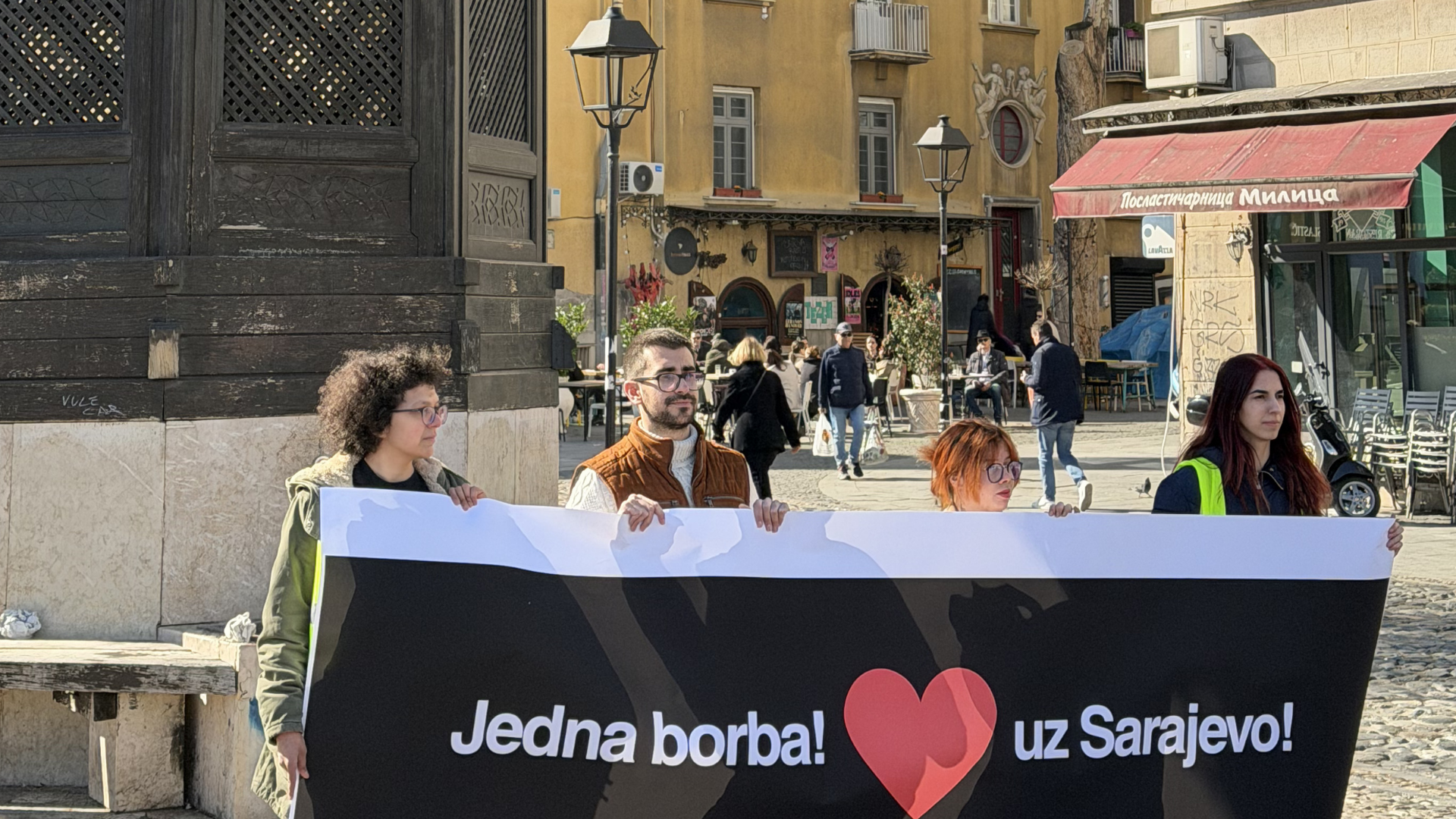 Skup je otpočeo na platou ispred Filozofskog fakulteta gde su se aktivisti/kinje Inicijative mladih obratili okupljenim građanima. Aktivista Aleksandar Milanović uporedio je tragediju u Sarajevu sa tragedijom u Novom Sadu, u kojoj je u padu nadstrešnice na Železničkoj stanici stradalo 16 osoba: „Opet isti obrazac, gde su sistemski nemar i korupcija oduzeli jedan mladi život i to na delu pruge koji nije imao upotrebnu dozvolu”. „Srednjoškolci i studenti su izašli na ulicu. Šetaju i protestuju protiv kriminala, etnonacionalizma i korupcije”, izjavio je Milanović, šaljući poruku građanima Sarajeva: „Poručujemo im da delimo istu borbu. Da delimo isti bes, ali i istu nadu da je moguće drugačije društvo. Društvo u kojem se životi ne gube zbog nemara i korupcije. Društvo u kojem odgovornost nije prazna reč”.